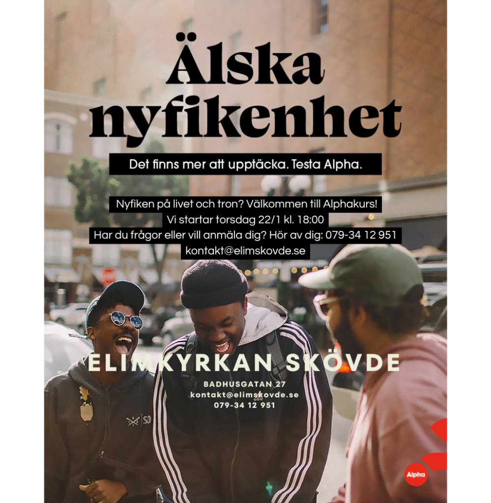 Alpha är en serie träffar där vi samtalar om livets stora frågor utifrån en kristen grund. Vi lyssnar på en kort föreläsning och samtalar i små grupper. Det behövs inga förkunskaper, inga frågor är för stora eller för små och alla är välkomna – oavsett om du är nyfiken, funderar över tro eller vill fördjupa den.
